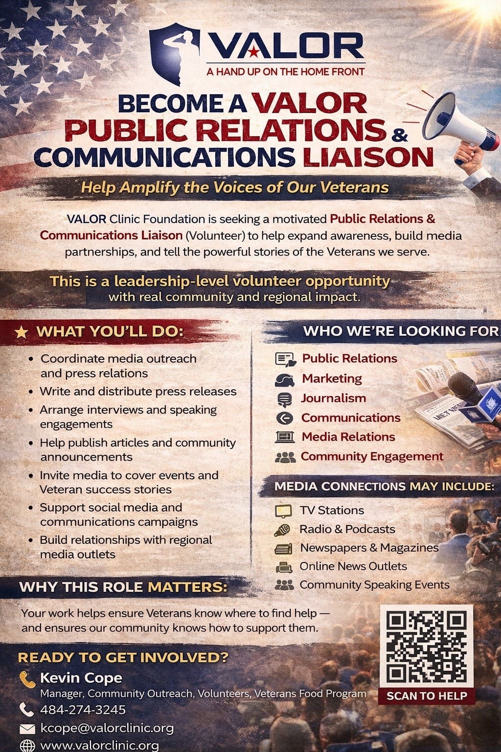 We are seeking a motivated Public Relations and Communications Liaison (Volunteer) to help ensure Veterans know where to find help - and to help ensure that our community knows how to support them.