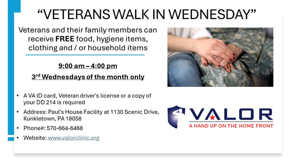 Veterans and their family members can receive FREE food, hygiene items, clothing and / or household items.